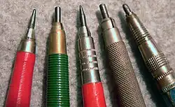 • Der Drehbleistift oder Füllbleistift erreicht den Vorschub der Mine durch einen Drehmechanismus des Stiftes anstatt mit Hilfe des Druckknopfes.