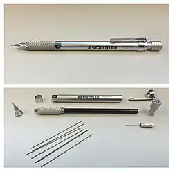 Die heute wohl gebräuchlichste Form eines mechanischen Stiftes verwendet Minen mit einer Stärke von 0,2 mm bis 1,18 mm, die von einer Klemmzange in einer Führung gehalten werden. Durch leichtes Öffnen der Klemmzange mittels des Druckknopfs auf dem Stiftkopf oder auf der Seitenfläche wird die Mine einige Millimeter vorgeschoben. Im Mantel des Stiftes können weitere Minen aufbewahrt werden. Die Führung kann starr oder gefedert gelagert sein, je nach Einsatz im technischen oder seltener auch im künstlerischen Bereich. Die übliche Länge der Minen beträgt 60 mm.