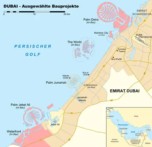 - Projekt Palm Islands, bestehend aus den drei Inselgruppen „The Palm, Jebel Ali“, „The Palm, Jumeirah“ und „The Palm, Deira“