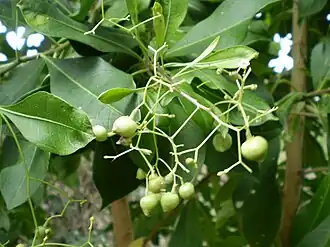 Aus den befruchteten Blüten entstehen violett-schwarze Beeren mit einer Größe von 4 bis 5 mm (zum Teil auch bis 8 mm), sie sind rund oder leicht abgeflacht, selten ellipsoid. Die Beeren enthalten nur wenig Samen, meist nur zwei bis neun, selten bis zu 12. Die Samen sind 2,2 bis 2,3 mm lang, der Embryo ist leicht gekrümmt.