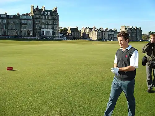 Text zum Bild: Hugh Grant auf dem Old Course in St Andrews bei den Alfred Dunhill Links Championship 2007.