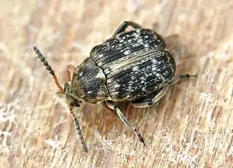 Die Käfer sind 3–5 mm lang.[2][3][4] Sie sind überwiegend graubraun bis schwarz gefärbt. Der Halsschild ist stark grau und gelblich behaart.[2][3] Lediglich die Scheibe ist schwächer behaart.[2][3] Der Seitenzahn des Halsschilds ist weit nach vorne gerückt.[2] Die Elytren weisen eine dichte graue Behaarung mit einer schwarzen Zeichnung auf.[3] Im vorderen Drittel befindet sich ein schwarzer Fleck im Bereich des 3., 4. und 5. Zwischenraums.[3] In der Mitte befindet sich eine dunkle Querbinde, die nur auf dem 2., 4. und 6. Zwischenraum durch eine helle Behaarung unterbrochen ist.[3] Die basalen Fühlerglieder sind gelbrot gefärbt. Die Vorderbeine mit Ausnahme der Tarsen sind ebenfalls gelbrot gefärbt.[3]