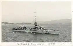 Die folgende Branlebas-Klasse schloss mit zehn weiteren Zerstörern (Glaive, Poignard, Sabretache, Oriflamme, Étendard, Fanion, Sape, Gabion, Branlebas und Fanfare)[4], die zwischen Juli 1908 uns November 1910 paarweise auf fünf Werften fertiggestellt wurden, den Bau der sogenannten 300-Tonner ab. Branle-bas und Étendard gingen während des Krieges verloren. Ab 1921 wurden die Boote gestrichen und zum Abbruch verkauft. Letztes Boot im Dienst war die als vorletztes Boot in den Dienst gekommene Glaive, die seit 1918 bei der Mechanikerschule in Brest in Dienst war und erst im Februar 1932 gestrichen und dann vor Jahresende verkauft wurde.