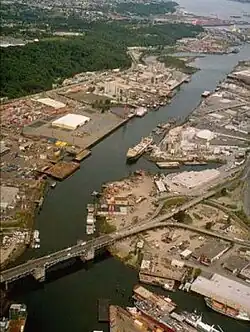 ![]() Unterlauf des Duwamish River mit der First Avenue South Bridge (Washington State Route 99). Kellogg Island ist im Norden sichtbar. | ||