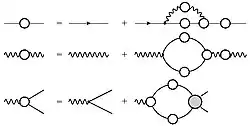 Identifiziert man die Terme in den Klammern mit der Elektronen- bzw. Photonenselbstenergie, so kann man in obigen Gleichungen die originalen Dyson-Gleichungen finden.