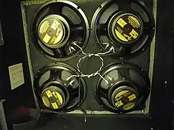 Der Gitarrenverstärker selbst wird in der Regel nicht nach Hi-Fi-Gesichtspunkten oder mit der Vorgabe der Klangneutralität designt. Vielmehr haben alle bekannten Gitarrenverstärker auch ohne Effekte und Übersteuerung einen bewussten Klangcharakter. Je nach Modell betont dieser die definierten Obertöne einer E-Gitarre oder das Tief/Mitten-Fundament, um dem Sound mehr Druck zu geben. Auch wirkt die Eingangsimpedanz des Verstärkers zusammen mit Kabel und Tonabnehmer klangbeeinflussend, weswegen einige E-Gitarren mit manchen Verstärkermodellen besser harmonieren als mit anderen.[5] Der Verstärker ist gerade im Rock-Bereich als charakteristischer Bestandteil der Klangerzeugung zu verstehen, weswegen sich in der Vergangenheit auch viele Modifikationen bestimmter Modelle etabliert haben, um einen bestimmten Sound zu erzielen. Auch die Lautsprecherbox (Cabinet) ist klangformend. Ein bekannter Lautsprecher-Hersteller ist Celestion.[6]