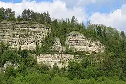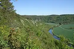 ![]() Zwischen Creuzburg und Mihla säumen die Werra über einhundert Meter hohe Muschelkalkwände, wie hier die Ebenauer Köpfe. | ||