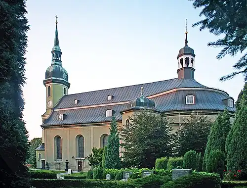Die evangelisch-lutherische Dorfkirche mit ihrem originellen Grundriss entstand zwischen 1726 und 1733 durch die Anfügung eines zentral gestalteten, aus Kreis und Polygon gemischten Ostbaus an einen älteren rechteckigen Langbau. Sie weist ein hölzernes Tonnen- und Kuppelgewölbe auf. Ringsum befinden sich Emporen in 3 Geschossen an deren unteren 54 biblische Gemälde von 1733 die Heilsgeschichte darstellen sowie eine den gesamten Raum abschließende Deckenmalerei der Holztonne. Am 29. September 1733 wurde die Kirche feierlich geweiht.