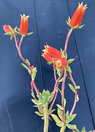 Der traubige Blütenstand besteht aus ein bis zwei Ästen und trägt an jedem Ast ein bis drei Blüten. Diese stehen an einem bis 3 Zentimeter langen Stiel. Die ausgebreiteten und nach oben gebogenen Kelchblätter werden bis 18 Millimeter lang. Die schmale und urnenförmige Blütenkrone wird bis 33 Millimeter lang und 16 Millimeter breit. Die scharlachroten Blütenblätter sind an den Rändern gelb gefärbt.