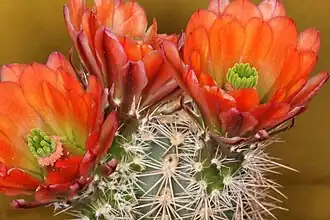 Die Knospen erscheinen aus einem wolligen weißen Polster mit rotbraunen Borsten. Die trichterförmigen, außen roten und innen gelblichen Blüten sind selten schiefsäumig. Sie werden 8 bis 12 cm lang und haben Durchmesser von bis zu 10 cm. Im Gegensatz zu den einhäusigen (monözischen) Blüten von Echinocereus polyacanthus sind die Blüten von Echinocereus polyacanthus subsp. acifer zwittrig und selbstbestäubend (selbstfertil). Die Staubgefäße sind gelb, die Narbe ist grün bis hellgrün. Die ovalen Früchte bleiben grünlich und messen 2 cm im Durchmesser und 3 cm in der Länge.