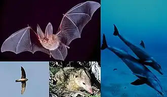 Beispielhafte Vertreter echoortender Tiergruppen. Im Uhrzeigersinn: Townsend-Langohr (Corynorhinus townsendii), Großer Tümmler (Tursiops truncatus), Großer Tenrek (Tenrec ecaudatus), Schwarznestsalangane (Aerodramus maximus)