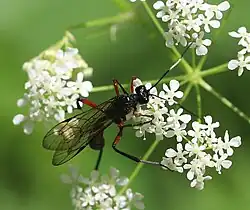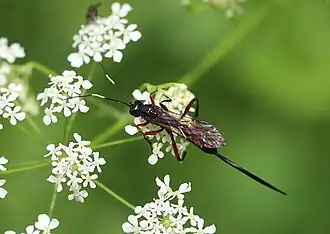 Die Schlupfwespen erreichen eine Körperlänge von 10–16 mm.[1] Die Weibchen besitzen einen überwiegend schwarzen Körper. Die Fühler weisen auf etwa halber Länge eine breite weiße Binde auf. Das zweite und das dritte Tergit sind rot gefärbt. Die Femora sind gewöhnlich rot gefärbt. Die mittleren und hinteren Femora können aber auch vollständig schwarz ausfallen. Die rot gefärbten vorderen Tibien sind seitlich verbreitert. Die Länge des kräftigen Legestachels (Ovipositor) liegt bei etwa 90 Prozent der Gesamtlänge von Thorax und Hinterleib. Die Männchen sind ebenfalls überwiegend schwarz gefärbt. Ihre Fühler weisen ebenfalls eine weiße Binde auf. Die vorderen und mittleren Femora sind rot gefärbt. Die Vorderflügel beider Geschlechter besitzen ein relativ schmales dunkles Pterostigma (Flügelmal).