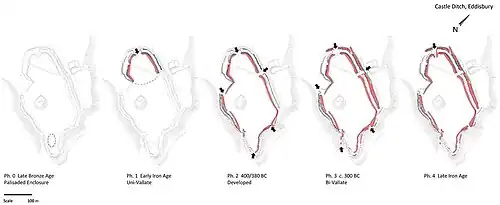 Eddisbury hat archäologisch zwei Phasen durchgemacht. In der ersten wurde der Ort von einem einzigen Wall und Graben umgeben. Diese Form wird als „univallate“ (einfachumwallt) bezeichnet. Die einfache Umbauung konzentrierte sich auf den östlichen Teil. Während der zweiten Phase belegt das Fort den gesamten Hügel und die Befestigung wurde durch zusätzliche Wälle und Gräben verstärkt. Das Hillfort vergrößerte sich von 2,2 auf 2,8 ha und das umwallte Gebiet umfasste mit über sechs Hektar, etwa 2,5 mehr als zuvor. Die Expansionsphase wurde auf 0–50 n. Chr. datiert.