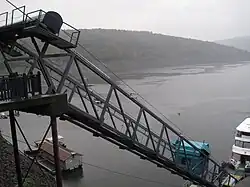 Schwimmanleger mit Kabinenseilbahn für Passagiere bei Niedrigwasser am Staumauer-Südende