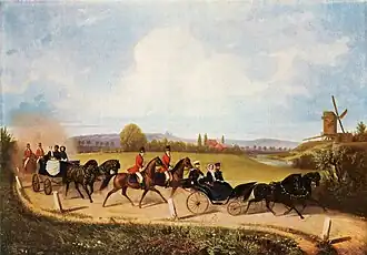 - 1855: Königin Marie vor dem Schloss Herrenhausen kurz vor dem morgendlichen Ausritt. Sie wird begleitet von einer Hofdame, zwei Adjutanten, dem Stallmeister und einem Stallburschen. Vor dem Schlossportal im Ehrenhof steht höflich der blinde König Georg V., um wenigstens dem Aufbruch beizuwohnen.[6]