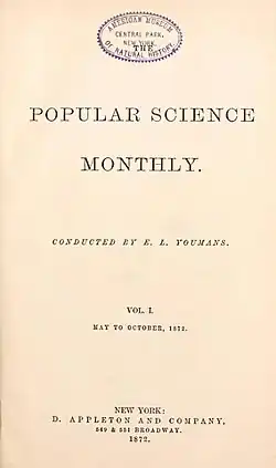 Im Rahmen der US-Erwachsenen- und Weiterbildung, damals in den Vereinigten Staaten Lyceum movement[1] genannt, bereiste Youmans in den Jahren 1852 bis 1869 sein Heimatland und trug populär über Themen aus der Physik und Chemie vor. Beeinflusst von dem Evolutionstheoretiker Herbert Spencer brachte er 1871 die International Scientific Series[2] heraus. In aller Welt, also in New York, London, Paris, Leipzig, St. Petersburg und Mailand, wurden Arbeiten zum Thema Wissenschaft versus Religion aus der Sicht des Darwinismus veröffentlicht. Edward Youmans gründete 1872 die Monatszeitschrift Popular Science Monthly und blieb bis zu seinem Lebensende ihr Herausgeber. Zu den Autoren der Zeitschrift zählten nach ihrer Gründung gegen Ende des 19. Jahrhunderts Charles Darwin, Thomas Henry Huxley, Louis Pasteur, Henry Ward Beecher, Charles Sanders Peirce, William James, Thomas Edison, John Dewey und James McKeen Cattell.