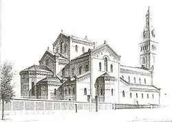 Rechts vom Glockenturm erhebt sich der Vierungsturm der Kirche. Deutlich sind die Konturen vom Dach des Vierungsturmes mit schwarzer Farbe vom Grau des Gebäudes abgesetzt, während beim Glockenturm solche Begrenzungen fehlen und dünne Pinselstriche die Fenster in der charakteristischen Turmspitze andeuten. Zwischen den beiden Türmen ist das schneebedeckte Dach des Kirchenschiffes zu erkennen, durchschnitten von einem davor stehenden Schornstein. Weitere Schornsteine finden sich zur Begrenzung der Horizontlinie am rechten Bildrand und rechts neben dem am linken Bildrand stehenden Wohnhaus, dessen Identität sich heute nicht mehr bestimmen lässt. Nur das obere Stockwerk und das Dach des vom Bildrand angeschnittenen Gebäudes sind ausgeführt. In der grau-ocker gehaltenen Fassade sind durch drei schwarze Farbtupfer die Fenster angedeutet. Auf dem oberen Bereich des schwarzen Daches ist kontrastreich mit weißer Farbe der darauf liegende Schnee skizziert. Zwischen diesem Haus und der Kirche sowie direkt vor der Kirche finden sich weitere dunkle Dächer, auf denen Schnee liegt, ohne dass diese Gebäude näher zu identifizieren sind.