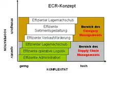 - Efficient Replenishment (dt. „Effiziente Warenversorgung“): Ziel ist es, ein effizientes Distributionssystem aufzubauen, d. h. den Warennachschub effizient zu gestalten. Dabei wird die Produktion anhand der Nachfrage der Kunden am Verkaufsstandort gesteuert. Der Kunde soll am richtigen Ort zur richtigen Zeit mit dem richtigen Produkt in der richtigen Menge und Qualität versorgt werden. Durch den elektronischen Datenaustausch wird versucht den Informationsfluss so effizient wie möglich zu gestalten.