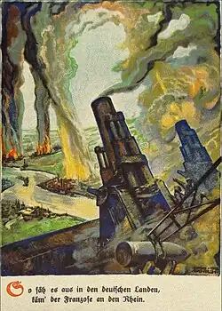 Als Soldat im Ersten Weltkrieg mehrmals verwundet, fertigte Tschirch nach seiner Teilgenesung 1917/18 Plakate, Flugblätter und Feldpostkarten für das Kriegspresseamt in Berlin an.[8] Dieses hatte den Künstler für die Abteilung bildliche Propaganda verpflichtet. In diesem Zusammenhang stehen Durchhalte-Plakate, welche alliierte Kriegsziele in düsteren Farben skizzieren und mit entsprechenden Texten verknüpfen. Nach Kriegsende kehrte er nach Rostock zurück, um dort noch 1918 erneut ein Atelier zu eröffnen.