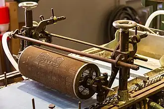 Ursprünglich wurde der Egoutteur (englisch dandy roll) lediglich als Glättinstrument für die raue Papieroberseiten auf Langsiebmaschinen eingesetzt (Einführung durch John Marshall, London 1826).[1] Die Funktion als strukturgebendes oder zeichnendes Element wurde erst in späteren Jahren hinzugenommen.[2] Der Einsatzort des Egoutteurs ist die Siebpartie kurz vor den Saugern bzw. kurz nach den ersten Saugern. Entscheidend für den Erfolg dieser Technik ist, dass die Papierbahn dick genug, auf dem Sieb schon leicht verfestigt und an der Oberseite noch flüssig ist. Wird der Egoutteur zu früh aufgesetzt, verläuft das Wasserzeichen wieder. Sitzt er zu weit an der Gautsche, verdrängt er die Faser nicht mehr richtig. Das Wasserzeichen wird dann flach und unscharf. Der Egoutteur wird nicht angetrieben und läuft lediglich durch die Siebreibung mit Bahngeschwindigkeit. Egoutteurwasserzeichen sind immer (echte) Verdrängungswasserzeichen.[3] Üblich sind auch Bespannungen mit Kunststoff oder Edelstahldraht bzw. -gewebe. Führender Egoutteurhersteller ist seit Jahren die Firma Kufferath in Deutschland.