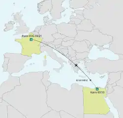 Der Airbus sollte um 01:10 UTC in Kairo landen. Das letzte Transpondersignal wurde den Radar-Daten zufolge um 00:30 UTC in der normalen Reiseflughöhe von ca. 37.000 Fuß (Flugfläche 370) gesendet. Die Maschine hatte zu diesem Zeitpunkt ungefähr den Bereich der ägyptischen Luftraumüberwachung erreicht und befand sich zwischen der griechischen Insel Kreta und der ägyptischen Stadt Alexandria. Durch das unvermittelte Abstürzen des Flugzeugs aus Reiseflughöhe ohne vorheriges Absetzen eines Notrufs durch die Cockpit-Besatzung war anfangs auch ein Anschlag für möglich gehalten worden.[1] Diese Hypothese wurde 2018 durch französische Ermittler widerlegt.