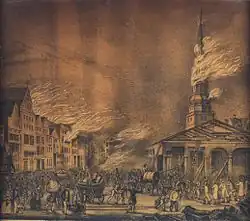 Am 5. Mai 1842, dem ersten Tag des dreitägigen Großen Brands, fiel St. Nikolai als die erste der Hamburger Kirchen und Großgebäude dem Feuer zum Opfer. Der Hauptgottesdienst am Morgen hatte noch abgehalten werden können, der Mittagsgottesdienst wurde nach einer Fürbitte für den Erhalt der Kirche abgebrochen. Um etwa vier Uhr nachmittags ergriff das Feuer den Turm. Es gelang wegen der unzulänglichen Löschtechnik nicht, Wasser in ausreichender Menge hinauf zu befördern. Schließlich stürzte er ein und übertrug die Flammen auf das Kirchenschiff, das vollständig niederbrannte. Nur wenige Kunstwerke waren zuvor aus dem Gebäude gerettet worden.