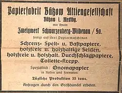 - ↑ Fritz Hoßmann: Papierfabrik am See wird zur Schuldenfalle. In: Bützower Geschichte aus dem Schuhkarton. Band 2. Fritz Hoßmann – Druckerei Karl Keuer, Bützow 2018, S. 10–12.