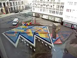 Auch wenn man es auf den ersten Blick nicht vermutet, ist der bunte Hajek-Brunnen auf dem Synagogenplatz ein Denkmal für die ehemalige Synagoge. Offiziell heißt das als Platzgestaltung ausgelegte Kunstwerk „Stadtikonographie mit Stadtzeichen und Wasserflächen“ und wurde 1977 zur „Verschönerung“ des Sparkassenvorplatzes und der darunter liegenden Tiefgarage gebaut. Ebenerdig lässt sich aus den buntbemalten Betonteilen auf verschiedenfarbigen Pflastersteinen und Gehwegplatten und der in der Mitte aufragenden Stahlskulptur kein Stadtpanorama erkennen. Erst ein Blick von oben offenbart das Kunstwerk. Es zeigt eine stilistische Stadtlandschaft mit Gebäuden in unterschiedlichen Graustufen. Nur der bunte Brunnen mit der Stahlskulptur sticht heraus. Er wandelt sich in Draufsicht als blau-orange-gelber Schattenriss der Synagoge. Die Stahlskulptur markiert als X das Zentrum des Platzes.