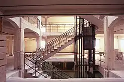 Ein zweiläufiger Treppenaufgang mit ornamentalem Metallgeländer und der mit unter Denkmalschutz stehende historische Lastenaufzug, der aus technischen Gründen nur bis Mitte der 1960er Jahre genutzt wurde, stellen die Vertikalerschließung dar. Die Büros und Ateliers sind mit gläsernen Trennwänden abgeteilt. Die große, schwere zweiflügelige Eingangstür aus Eichenholz wurde restauriert und an anderer Stelle wieder eingebaut.