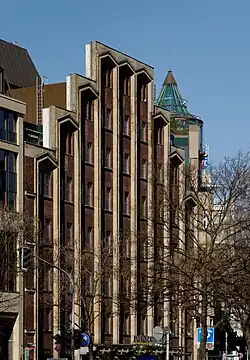 Das Gebäude im Stil der konservativen Moderne stand in der Tradition norddeutscher Backsteinarchitektur. Im Auftrag der Düsseldorfer Bürohausgesellschaft wurde es 1925/1926 nach Entwürfen der Düsseldorfer Architekten Tietmann & Haake erbaut. Die beiden Obergeschosse bilden einen dreistufigen Blendgiebel. Eine Art Maßwerk in Form von übereinandergestaffelten Blendarkaden durchbricht den Blendgiebel. Der Backsteingiebel wird durch eng gereihte Werksteinpfeiler gegliedert. Das Gebäude wurde im Zweiten Weltkrieg beschädigt, aber wieder aufgebaut.