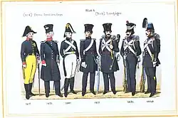 - 1806: Einen dunkelblauen Spenzer mit rotem Kragen und roten Ärmelaufschlägen, gelbe Hosen, dunkelblauer Zweispitz.
