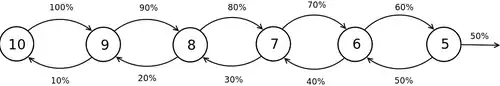 Der Übergangsgraph enthält die Zustände bis , welche die Anzahl der Moleküle im linken Behälter repräsentieren. Die Markow-Kette startet im Zustand . Vervollständigt man den Übergangsgraphen und erstellt eine dazu passende Übergangsmatrix, kann man die Wahrscheinlichkeitsverteilungen für die Anzahl Moleküle im linken Behälter für jeden Zeitpunkt bestimmen. Nach Zeiteinheiten besteht mit einer Wahrscheinlichkeit von % zum ersten Mal die Möglichkeit zum physikalischen Gleichgewicht.