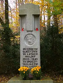 Text auf dem polnischen Mahnmal: „Treu dem Vaterland in den Jahren des Krieges 1939–1945 – den hier ruhenden Polen – Die Landsleute“.