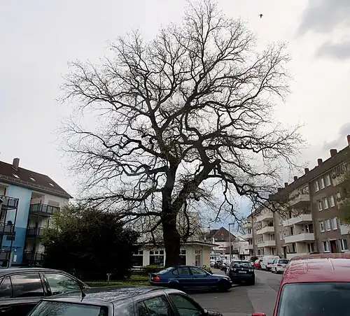 - Eiche mit stark verzweigter Krone, die den Straßenraum in besonderer Weise prägt.