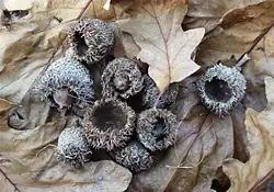 Eichen sind insbesondere an ihrer Frucht, der Eichel (von althochdeutsch eihhila „das Junge der Eiche“[4]), früher auch Aichel, Ecker und lateinisch glans[5][6] genannt, zu erkennen und in den einzelnen Arten zu unterscheiden. Die Eichel ist eine Nussfrucht. Sie reifen im ersten oder zweiten Jahr nach der Bestäubung. Jede Nussfrucht ist von einem Fruchtbecher umgeben.