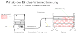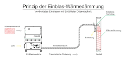 Beim Einblasverfahren wird Wärmedämmstoff mittels einer Einblasmaschine in Bauteile von Gebäuden eingebaut, man spricht auch von der Einblasdämmung. Der Wärmedämmstoff wird der Maschine zugeführt. Die von einem Kompressor gespeiste Einblasmaschine bricht den im Liefergebinde verdichteten Wärmedämmstoff in Stücke und lockert ihn anschließend weiter auf. Der aufgelockerte Wärmedämmstoff wird zusammen mit Luft über einen Schlauch in die zu dämmenden Bauteile transportiert. Im Bauteil verteilt sich der Wärmedämmstoff raumfüllend, wird durch den Druck verdichtet und wird damit zur Wärmedämmung.
