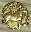 42 | Goldmünzen von Kumaragupta I. (BM 1894,0506.962) | Indien | 415–447 | Diese Münze aus der Regierungszeit Kumaraguptas (415–455) erinnert an das Pferdeopfer („Ashvamedha“) der Könige des Gupta-Reichs in Nordindien. Im Laufe dieser Dynastie-Zeit wurden solche älteren Rituale der Vedischen Religion weitgehend abgelöst durch die weniger aufwändige Tempel-Religiosität in den verschiedenen Ausformungen des Hinduismus.[62] |