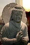 41 | Sitzender Buddha aus Gandhara (BM 1895,1026.1) | Gandhara, Pakistan | 100–400 | Eine der ältesten erhaltenen Skulpturen eines Buddha; im Buddhismus waren vor dem 1. Jahrhundert nur symbolische Darstellungen üblich. Dieser im Lotossitz verweilende, als Mönch gekleidete Buddha ist dargestellt im Zustand des Erwachens („Bodhi“).[61] |