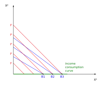 Man betrachte die Einkommens-Konsum-Kurve im Zwei-Güter-Fall. Die Einkommens-Konsum-Kurve steigt, wenn beide Güter normal sind, das heißt, wenn eine Einkommenserhöhung zu einer erhöhten Nachfrage nach den jeweiligen Gütern führt (siehe Abb. 1). Hingegen fällt sie, falls es sich bei einem der Güter um ein inferiores Gut handelt (Abb. 2). (Man bezeichnet ein Gut als inferior, wenn die Nachfrage mit steigendem Einkommen [absolut] sinkt.)