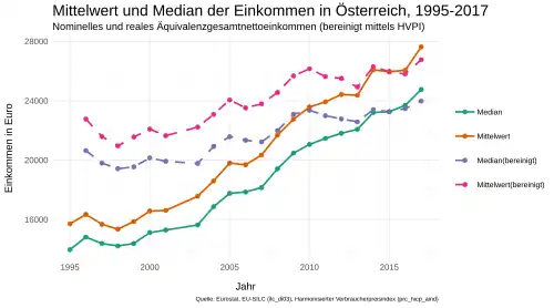 Weitere für den internationalen Vergleich geeignete und geläufige Indikatoren sind die Verteilungsmaße Mittelwert (auch durchschnittliches Einkommen genannt) sowie der Median der Einkommen (auch mittleres Einkommen genannt). In Österreich betrug das nominelle Durchschnittseinkommen im Jahr 2017 27.629 Euro, das Medianeinkommen belief sich auf 24.752 Euro. Betrachtet man das nominelle Durchschnittseinkommen über den Zeitraum 1995 bis 2017 kann man einen positiven Trend wahrnehmen. Lag das durchschnittliche Einkommen 1995 noch bei circa 16.000 Euro, so ist es im Jahr 2017 auf circa 27.500 Euro angestiegen. Eine ähnliche Entwicklung lässt sich beim nominellen Medianeinkommen beobachten, 1995 lag es bei circa 14.000 Euro und kletterte im Jahr 2017 auf eine Höhe von circa 24.500 Euro.[6]
