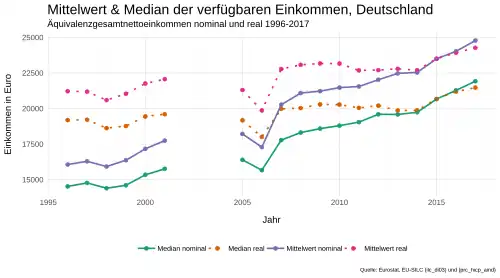 Das reale Einkommen drückt, als ein Indikator für Kaufkraft, die Menge an Konsumgütern aus, die ein Konsument mit einem bestimmten nominalem Einkommen erwerben kann. Die realen Werte werden berechnet, indem die nominalen Einkommen bzw. die nominale Kaufkraft um einen Preisindex (z. B. das Preisniveau für Konsumgüterpreise) bereinigt/dividiert werden.[25] Steigen die Preise der Konsumgüter, dann sinkt das Realeinkommen, weil man mit einem bestimmten Einkommen weniger Güter erwerben kann. Der Median des real verfügbaren Äquivalenzeinkommens misst, wie viel sich eine Person in der Mitte der Einkommensverteilung jährlich leisten kann und ist somit eine wichtige Größe zur Beurteilung des materiellen Wohlstandes.[26]