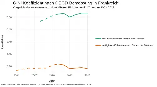 In Frankreich ist der Gini-Koeffizient über die Beobachtungsdauer von 2004–2016 relativ konstant geblieben und ist im Durchschnitt ein wenig unter dem Wert von 0,3 gelegen. Während der Weltfinanzkrise von 2008 bis 2011 erfolgte ein relativ starker Anstieg des Gini-Koeffizienten und damit der Einkommensungleichheit. Im Verlauf der darauffolgenden Jahre ist der Gini-Koeffizient in Frankreich allerdings wieder abgesunken. In der Grafik ist neben dem gängigen Gini-Index für die Einkommen nach Steuern und Transfers auch der Gini-Index für die reinen Markteinkommen als die Bruttoeinkommen zu sehen. Auch in dieser Statistik hat es während der Weltwirtschaftskrise einen nicht unbedeutenden Anstieg gegeben. Insgesamt fällt auf um wie viel der Wert des Gini-Koeffizienten für die Markteinkommen über dem Wert für die verfügbaren Einkommen liegt. Diese Diskrepanz zeigt das Ausmaß und den Erfolg, mit dem der Staat die Einkommen seine Bürger im Interesse einer ausgewogeneren Verteilung und sozialen Stabilität umverteilt. Im Jahr 2017 lag der Gini-Koeffizient unter dem gewichteten Durchschnitt der Europäischen Union von 0,307.[2] Im Vergleich zu den Gini-Koeffizienten der restlichen EU-Mitgliedsstaaten befand sich Frankreich im Jahr 2017 an 14. Stelle und damit im Mittelfeld.
