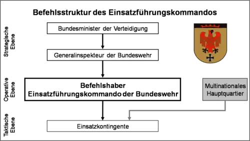 Die nationale Kommandokette der Einsatzkräfte der Bundeswehr gliederte sich in die strategische, die operative und die taktische Ebene. An der Spitze dieser Kommandokette stand auf der strategischen Ebene mit dem parlamentarischen Mandat der Bundesminister der Verteidigung. Diesem direkt unterstellt ist der Generalinspekteur der Bundeswehr. Die operative Ebene bildete das Einsatzführungskommando. Im Stab des Kommandos wurden die Vorgaben aus politischen Entscheidungen in militärische Aufträge, Befehle und Weisungen umgesetzt. Die Führung der verschiedenen Einsatzkontingente bildete die taktische Ebene.