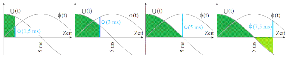 Im Bild sind für vier Zeitpunkte ab Einschaltzeitpunkt t = 0, jeweils im Scheitel der Spannung bis zum variablen Ausschaltpunkt, die Spannungszeitflächen grün dargestellt. Man erkennt, dass die grüne Fläche, also Φ von t = 0 ms bis t = 5 ms ansteigt. (Der Magnetfluss, die Remanenz, sei bei Beginn jeweils = 0.) Dann hat der Magnetfluss Φ seinen Maximalwert. Ab diesem Zeitpunkt liegen die weiter anwachsenden Flächenstücke unterhalb der Zeitachse, sind hellgrün dargestellt und zählen negativ. Als Folge wird der magnetische Fluss Φ (die vorzeichenrichtige Summe beider Flächen) wieder kleiner und erreicht zum Zeitpunkt t = 10 ms den Wert null.