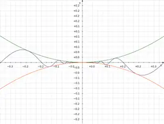 Man betrachte , das auf ganz außer für definiert ist. Den Grenzwert für auf konventionelle Art zu berechnen fällt schwer: Eine direkte Substitution schlägt fehl, weil die Funktion bei nicht definiert ist (geschweige denn stetig), und die Regel von de L’Hospital kann auch nicht angewendet werden, da überall oszilliert und keinen Grenzwert hat. Mit passenden oberen und unteren Schrankenfunktionen lässt sich jedoch der Einschnürungssatz anwenden.