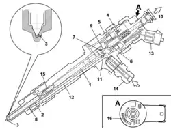 Als Einspritzdüse wird das Einspritzventil im Dieselmotor bezeichnet. Eine andere Benennung ist Injektor.