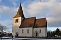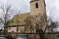 Ev. Dorfkirche | 1609/1610 (Urspr. romanisch), bemalte Kassettendecke auf Zentralstütze, eingeschossige Emporen ohne Deckenstützen |