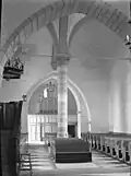 Chorturmkirche, gemauerter Chorbogen, im Schiff mittiger Unterzug auf Holzpfeiler, siehe[10] |