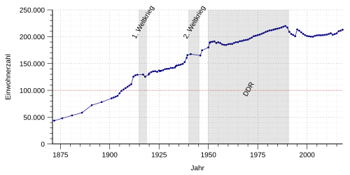 Die folgende Übersicht zeigt die Einwohnerzahlen nach dem jeweiligen Gebietsstand. Bis 1811 handelt es sich meist um Schätzungen, danach um Volkszählungsergebnisse (¹) oder amtliche Fortschreibungen der Stadtverwaltung (bis 1944), der Staatlichen Zentralverwaltung für Statistik (1945 bis 1989) und des Statistischen Landesamtes (ab 1990). Die Angaben beziehen sich ab 1840 auf die „Zollabrechnungsbevölkerung“, ab 1871 auf die „Ortsanwesende Bevölkerung“, ab 1925 auf die Wohnbevölkerung und seit 1966 auf die „Bevölkerung am Ort der Hauptwohnung“. Vor 1840 wurde die Einwohnerzahl nach uneinheitlichen Erhebungsverfahren ermittelt.