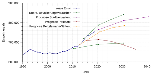 Nach der im Juni 2015 veröffentlichten Regionalisierten Bevölkerungsvorausberechnung bis 2040[15] sollte die Einwohnerzahl in den nächsten Jahrzehnten weitaus stärker steigen als nach früheren Prognosen. Ursache war das starke Bevölkerungswachstum seit etwa 2005, in Verbindung mit der Entwicklung des Wohnungsbaus. Es wurde erwartet, dass bis 2030 neue Wohnungen für etwa 70.000 Einwohner entstehen. Wegen des starken Zuzugs verhältnismäßig junger Menschen sollte das Durchschnittsalter bis 2040 nur leicht von 41,09 auf 41,86 Jahre steigen.
